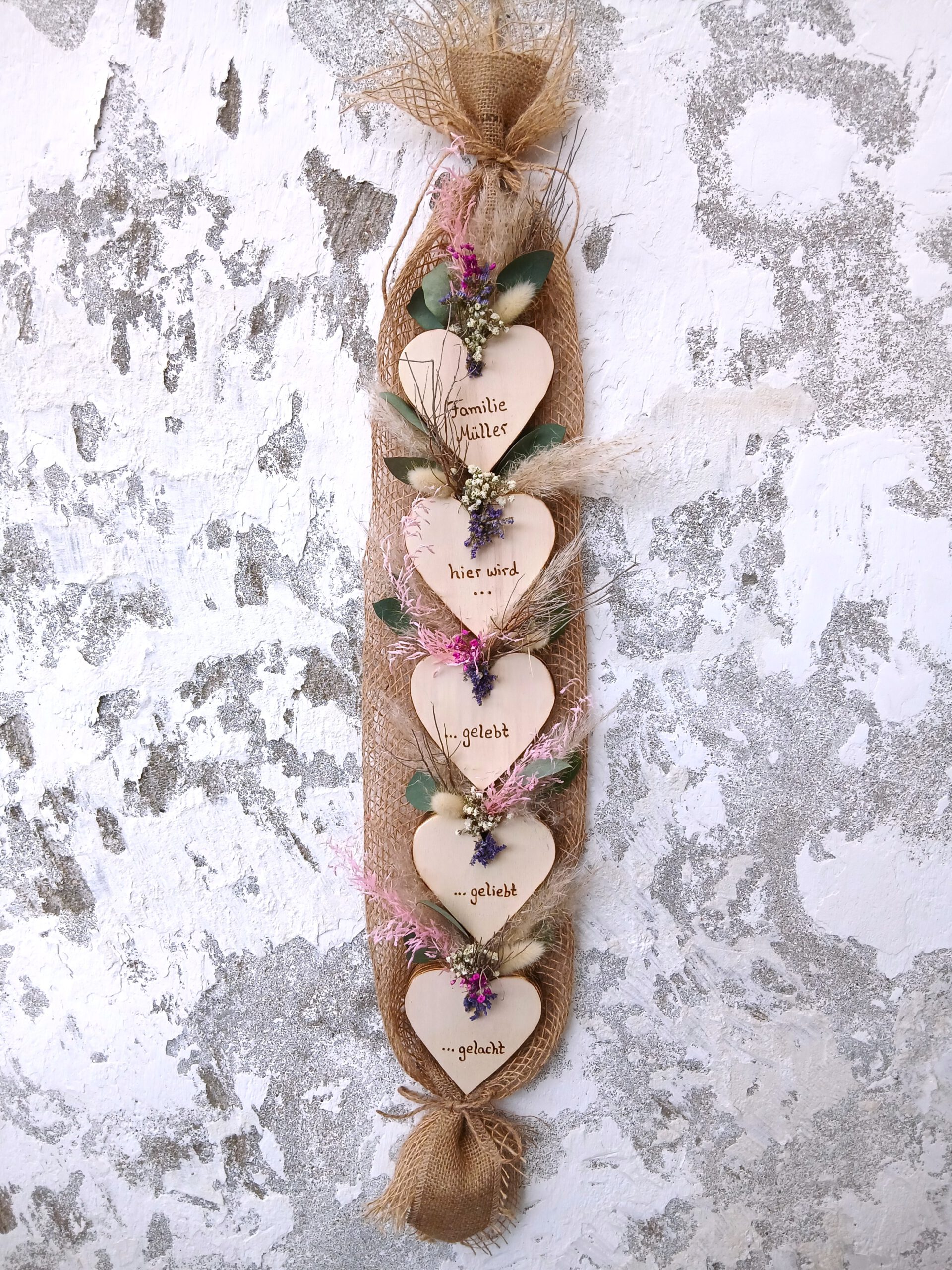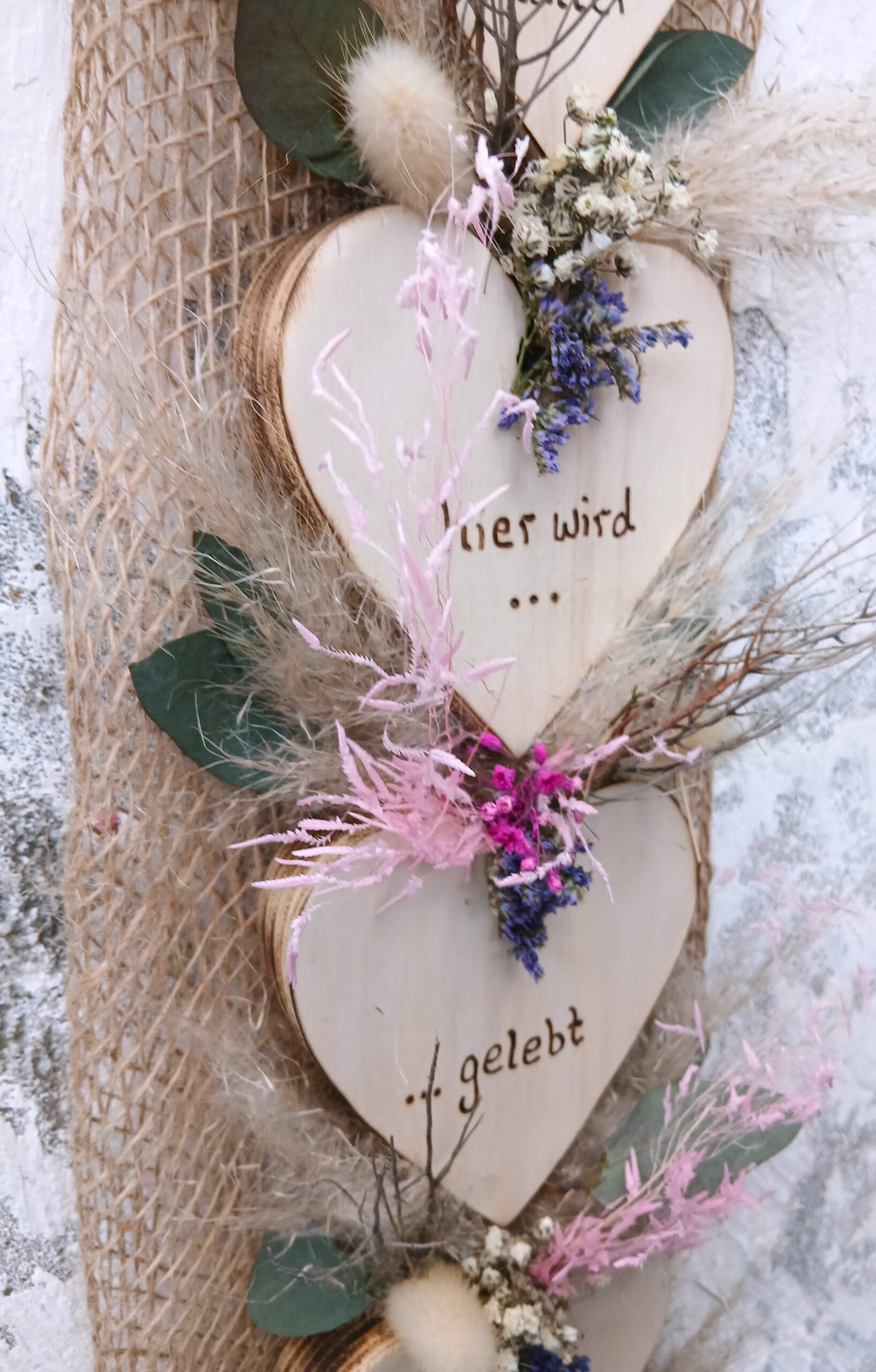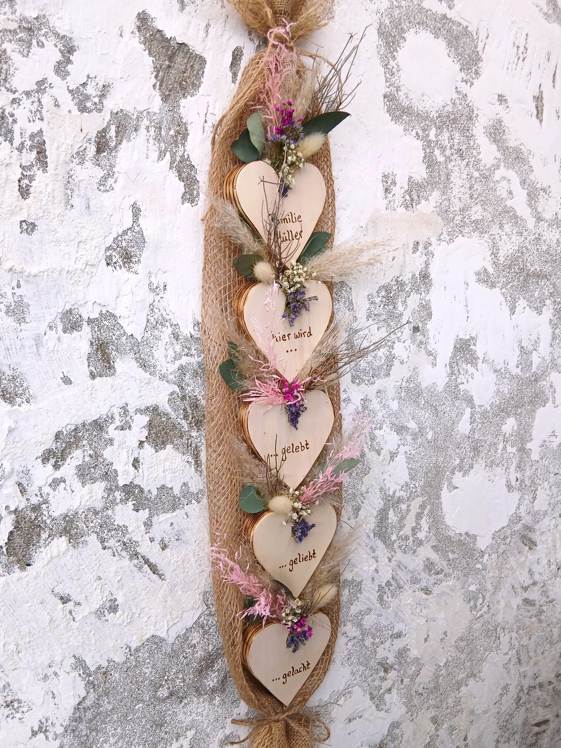Deko Herzen „Hier wird gelebt, geliebt, gelacht“ Haustürdeko aus Holz & Trockenblumen