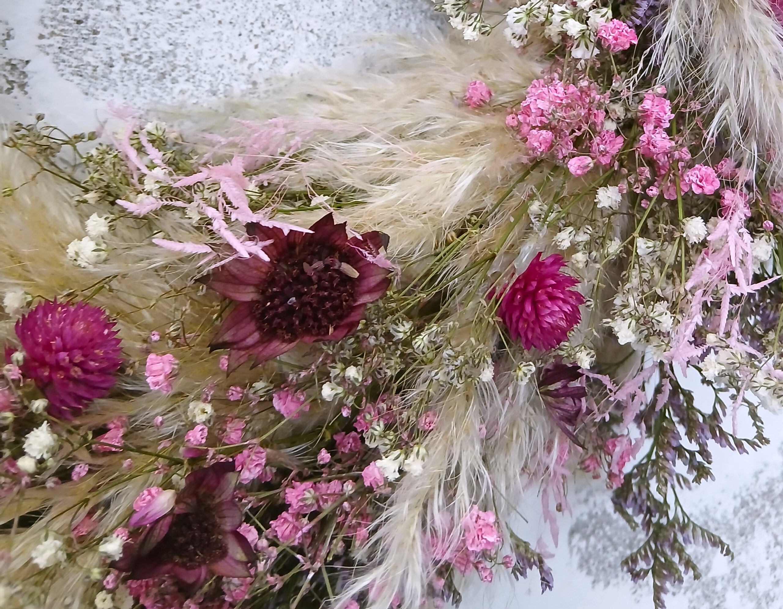 Die eingearbeiteten Blüten sind hochwertige Trockenblumen und bestehen aus: Disteln, rosa Pfefferbeeren, Pampas, Schleierkraut.