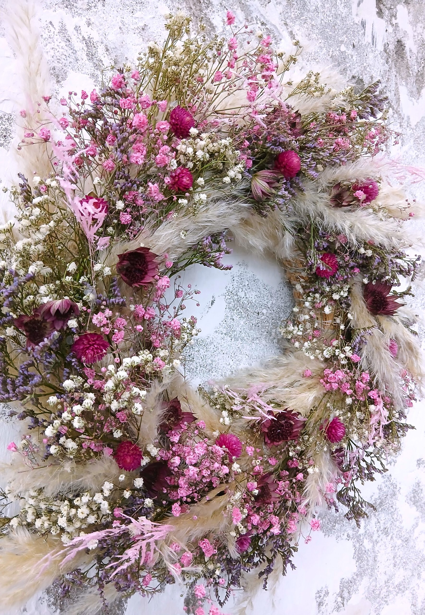 Bitte beachte: Trockenblumen sind ein Naturprodukt. Kleine Abweichungen in Farbe und Form machen jeden Kranz einzigartig und stellen keinen Mangel dar.
